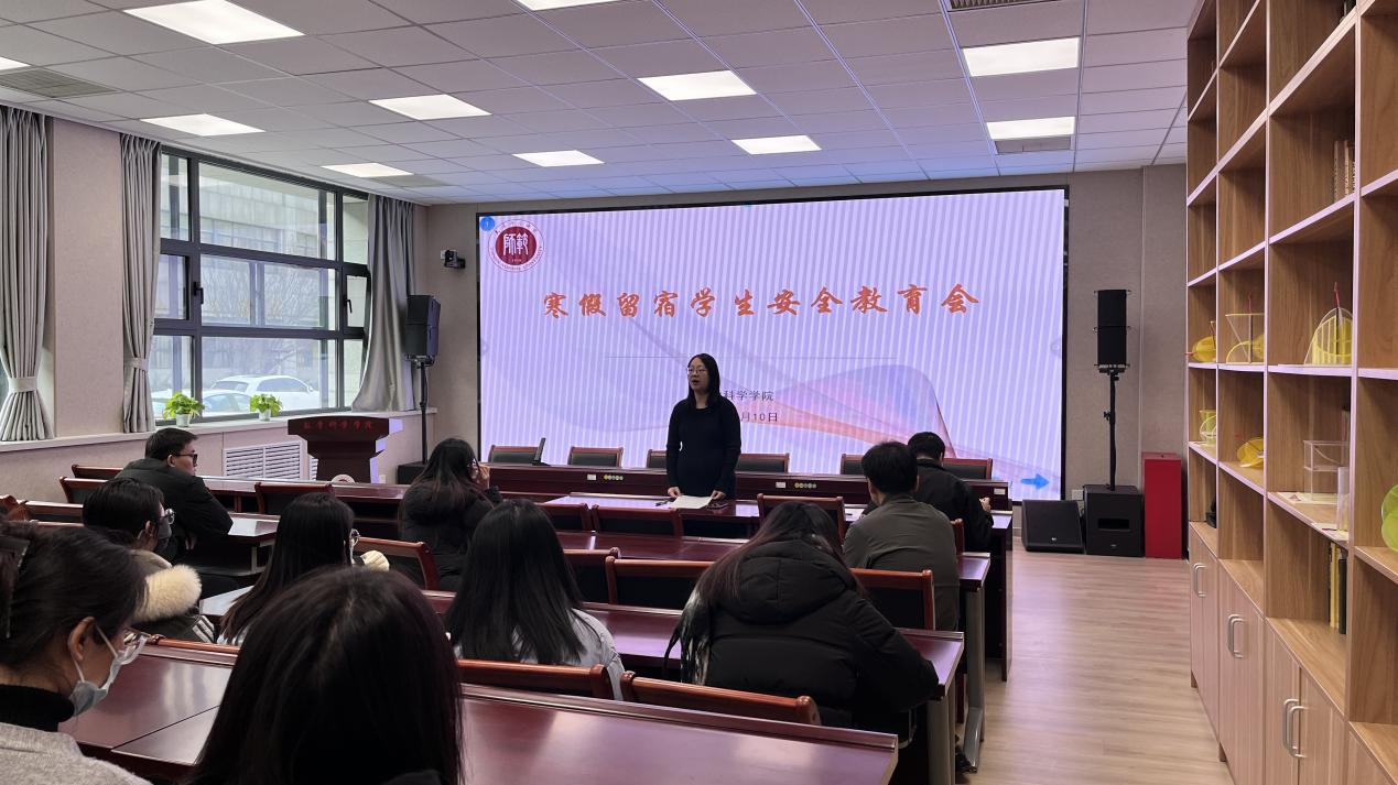 为做好寒假留宿学生的管理、服务工作,强化留宿学生安全意识,2024年1月10日,js6668金沙登录入口召开寒假留宿学生安全教育会,学院党委副书记彭永刚、学工办主任王建君、辅导员上官萌萌出席,全体假期留宿学生参加会议。