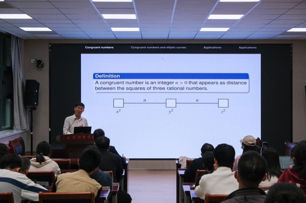 秦厚荣回顾了同余数问题悠久的发展历史及以中科院田野教授为代表的国内外数学家们在同余数问题研究中取得的突出成就,详细介绍了自身团队在这一问题上的研究成果,着重讲解了同余数问题与BSD猜想的密切联系。